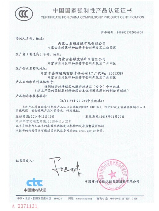 内蒙古嘉耀玻璃通过中国国家3C质量检验认证
